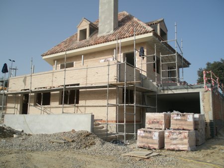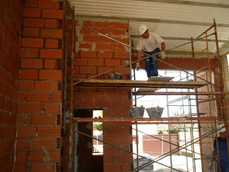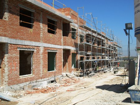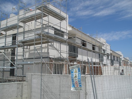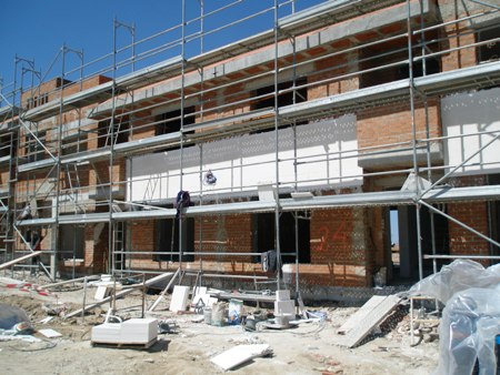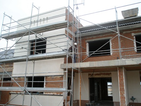 VISITA DE OBRA - 8 VIVIENDAS UNIFAMILIARES EN ARROYOMOLINOS URBANIZACION LA RINCONADA (29-marzo-2011 ) se han terminado completamente la hoja exterior de las fachadas y se ha comenzado a montar los andamios para realizar el aplacado de piedra que recubrira toda la fachada. En el interior se esta comenzando a realizar los enlucidos de yeso maestrados.
