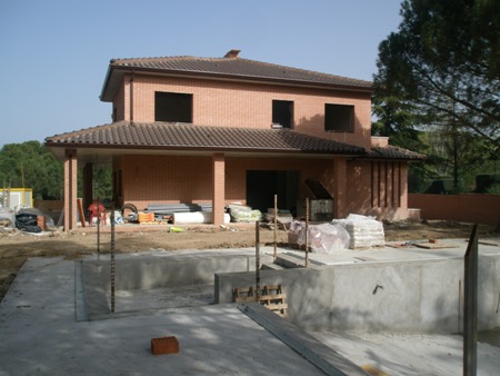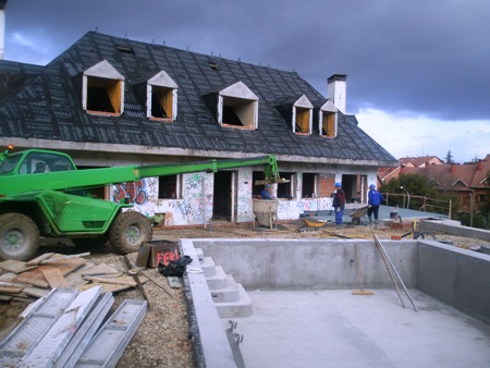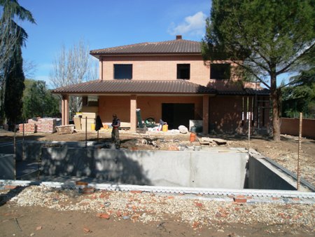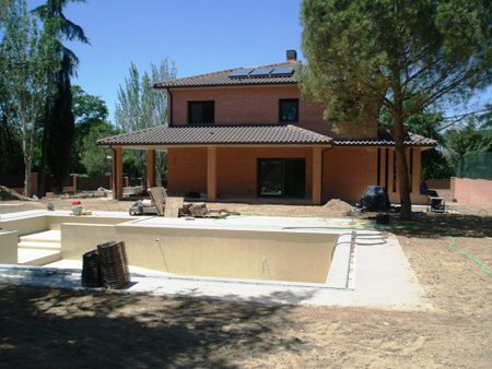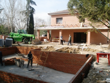 Se estan colocando la pendiente de la cubierta y la teja . La piscina esta preparada para colocar el mallazo y gunitar sobre los muros de ladrillo .