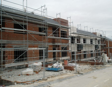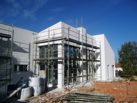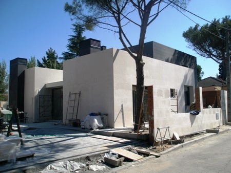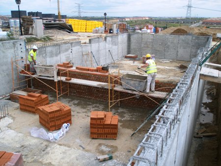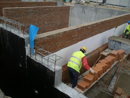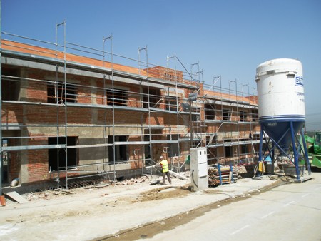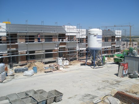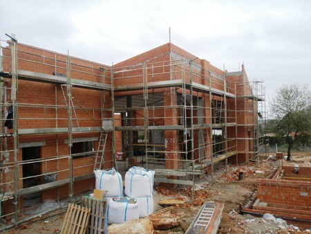 Se esta terminando la hoja exterior de las fachadas y se ha enfoscado interiormente con mortero hidrofugo, preparado para recibir el aislante de poliuretano proyectado , antes de comenzar la distribución interior.