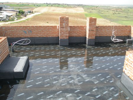 VISITA DE OBRA - 8 VIVIENDAS UNIFAMILIARES EN ARROYOMOLINOS URBANIZACION LA RINCONADA (8-abril-2011 ) se han colocado los andamios para comenzar con el revestimiento de la fachad. Se estan haciendo las pruebas de estanqueidad de la cubierta, indundando las cubiertas con agua..