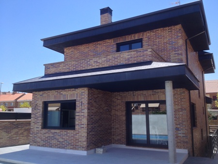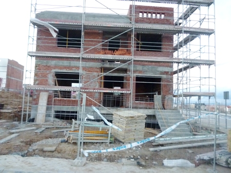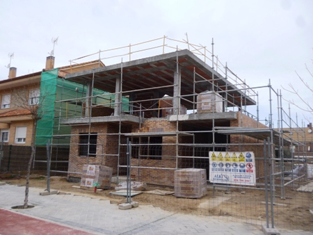 VISITA DE OBRA - VIVIENDA UNIFAMILIAR EN ARROYOMOLINOS ( 18-Febrero-2014 ) La estructura se ha terminado y se ha comenzado con la albañileria exterior de ladrillo cara vista , con el replanteo de huecos de fachada.