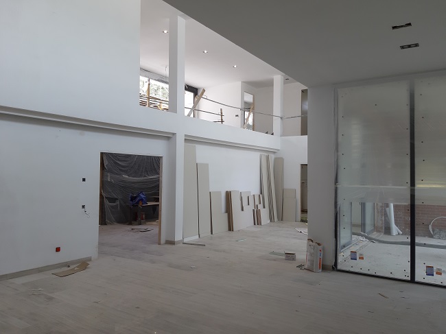DE OBRA Se estan realizando los acabados interiores de pintura y decoración interior de la vivienda, La imagen muestra el salón a doble altura con el pasillo de acceso a los cuartos de la planta primera.